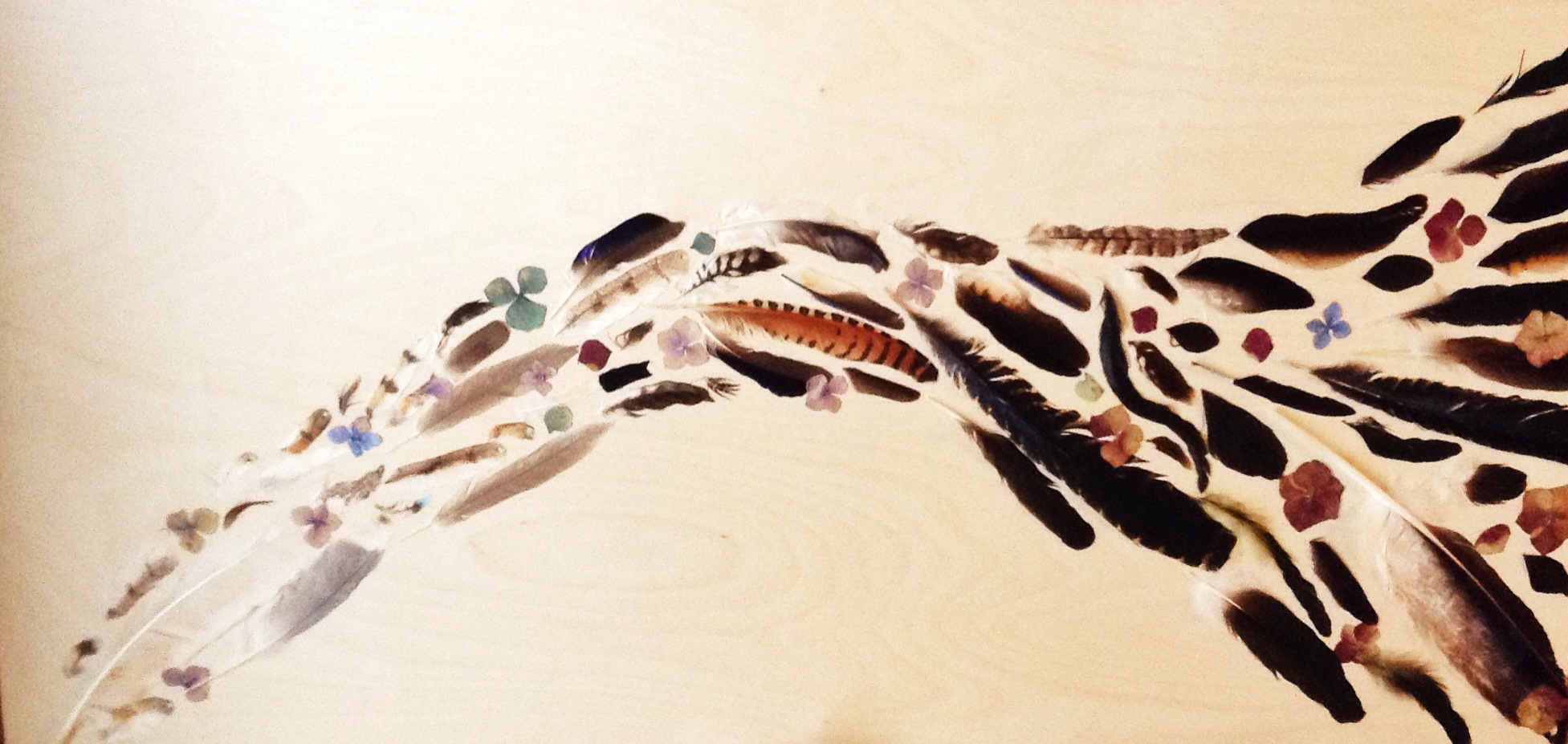 Mixed media on pine wood: Feathers from my collection that I gathered while travelling; Blue kookaburra, barn owl, collared sparrow hawk, whistling kite. Pressed flowers I found at the West Vancouver seawall.