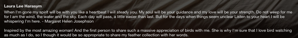 My Amma’s passion was birds she loved birds and it was known by everyone whom knew her. She had bird baths, feeders and little dishes all over her yard filled with treats for her birds. She would talk to them and they would sing back to her with delight. She passed on her love to me as a small child. She would share there names with me and let me help her feed them. I instantly felt that passion for our feathered friends and it has stuck with me ever since.
